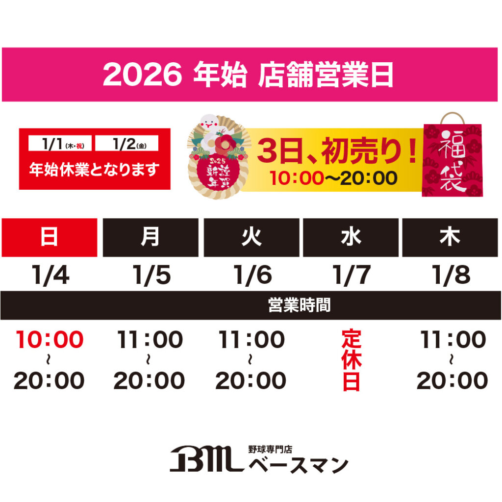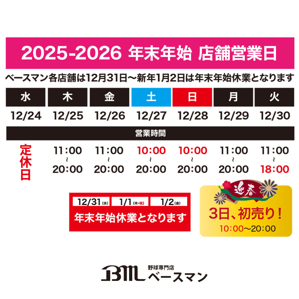 野球専門店ベースマン2025-2026年末年始営業時間のお知らせ