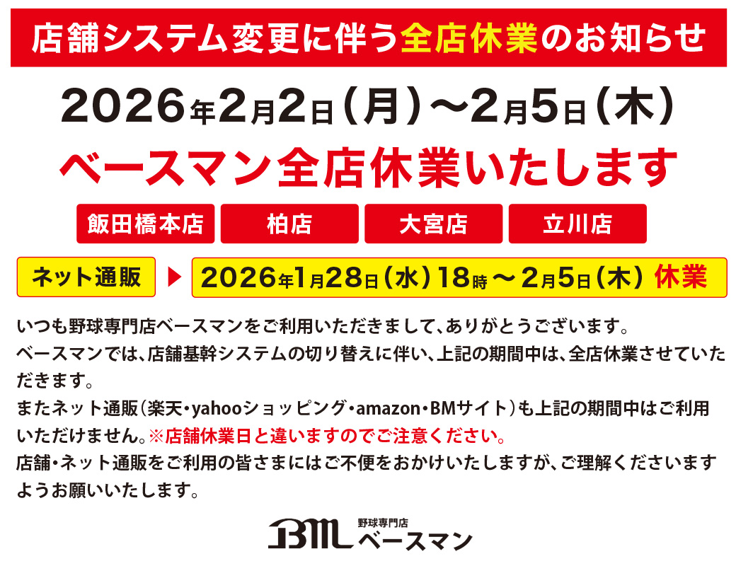 野球専門店ベースマン店舗システム変更に伴う全店休業のお知らせ